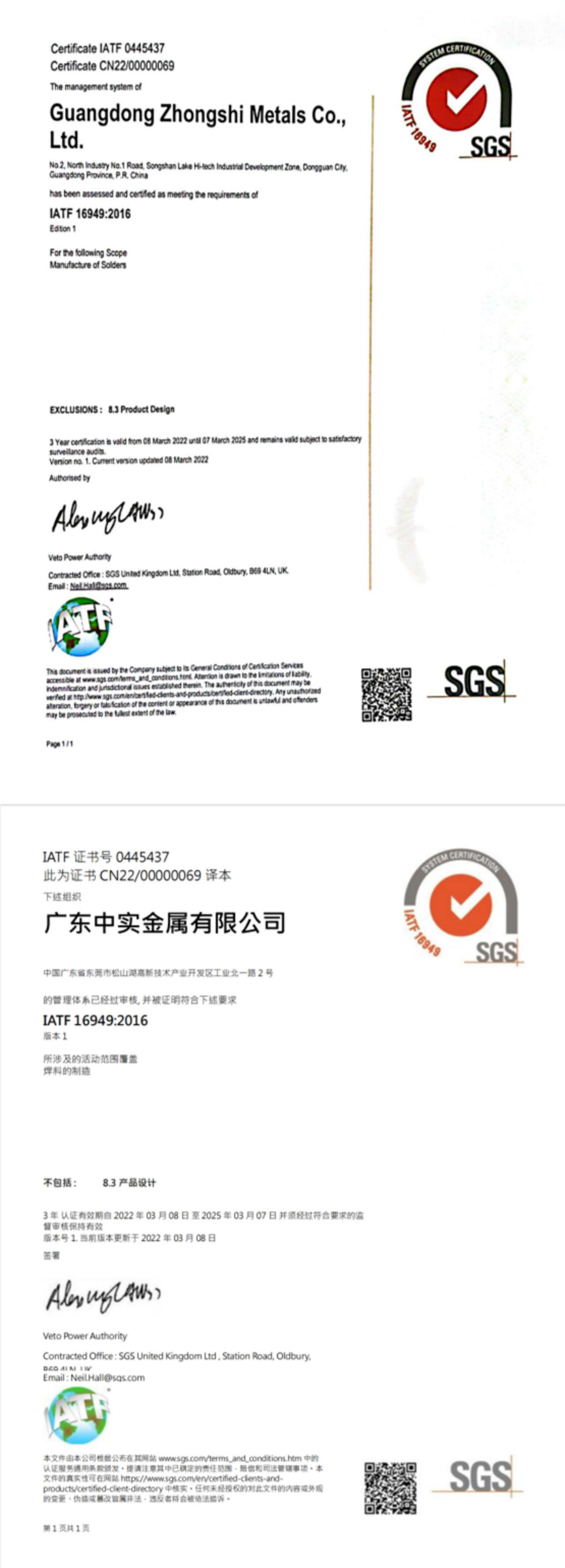 作為深耕高端焊料20多年的行業頭部企業,中實公司一直遵循嚴格的管理體系與方法進行產品研發和生產,公司先后通過了ISO9001質量管理體系認證、ISO14001環境管理體系認證、QC080000危害物質過程管理體系認證等。