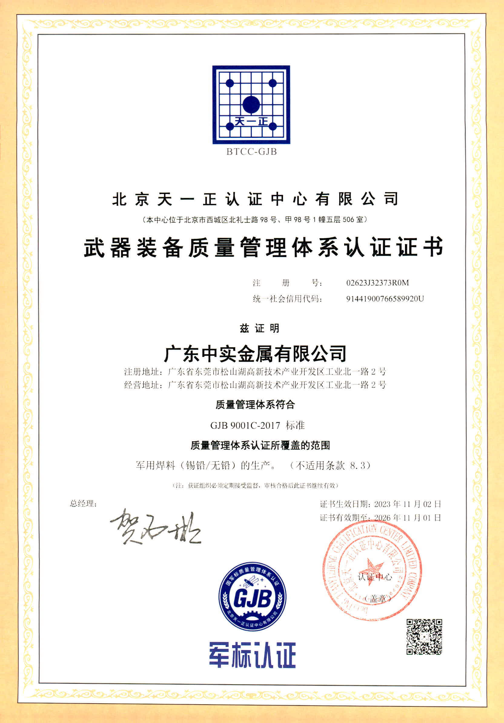 11月2日,廣東中實金屬有限公司順利通過GJB9001C-2017軍工產(chǎn)品質(zhì)量管理體系認(rèn)證,獲得北京天一正認(rèn)證中心有限公司頒發(fā)的《武器裝備質(zhì)量管理體系認(rèn)證證書》。